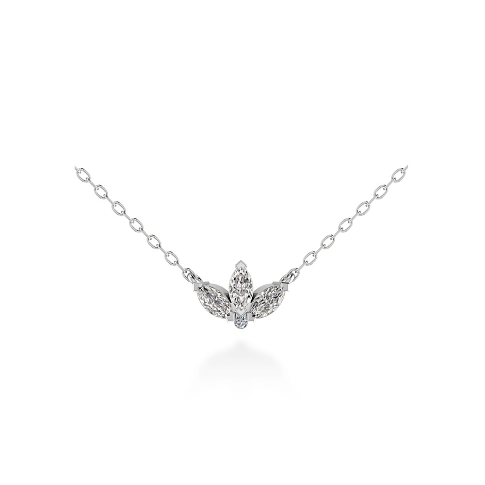 Collana fiore con diamanti, con pendente a tre diamanti naturali taglio marquise e diamantino naturale taglio brillante, realizzabile in oro 18 k bianco, giallo o rosa, certificata IGI Anversa.