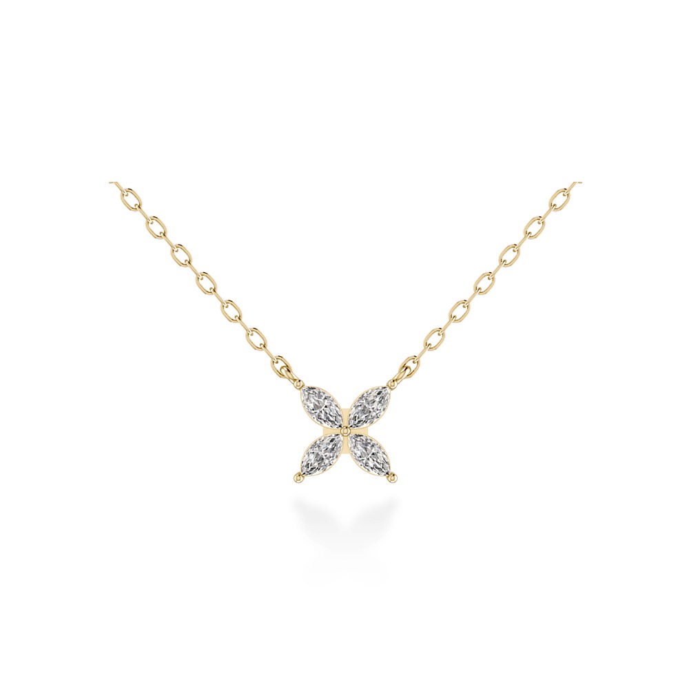 Collana fiore con diamanti in oro 18 carati, con pendente a 4 diamanti taglio marquise, disponibile in oro bianco, oro giallo e oro rosa.